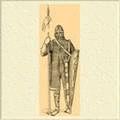 Шлем на воине каркасного типа с наносником; доспех относится к т. н. типу «мойплен», состоит из металлических бляшек круглой, шестигранной или другой формы, нашитых на кожу или холст.